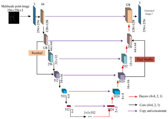 The goal of the generator is to reconstruct a high-quality image directly from the multiscale points feature map. Therefore, the details of the original image should be restored to the multiscale local maxima. The generator should be able to connect the features of different feature layers in the generator network effectively, maximize the information flow transmission from the shallow network to the deep network, and enhance the repeatability of the features. The structure of the proposed generator network is shown in Figure 3.