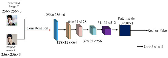 As shown in Figure 5, the fully convolutional neural network architecture is also used in the discriminator network. The network outputs a discrimination matrix, where the convolution kernel size for the convolution operation is 3 × 3, the step size is 2 × 2, and the edge zero padding is 1 × 1. The detailed parameters are collected in Table 3.