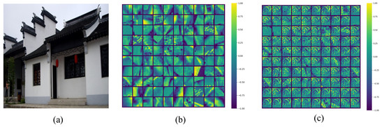 Feature map transformation process: (a) an original image; (b) feature maps presented consecutively in the output of the generator network; (c) feature maps presented consecutively in the discriminator.