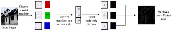 Based on the GAN, the overall architecture of the proposed IR-DWT-CGAN model was designed, as shown in Figure 2. An image was transformed into the DWT domain using a discrete wavelet transform, and the maximal points in the DWT domain were chosen as interest points for performing an inverse DWT to obtain a very coarse version of the image, which is called the multiscale points feature map. The multiscale points feature map, whose dimension is the same as the original image, is the input of the generator network. Based on the multiscale points feature map, the generator reconstructs the original image in such a way that the reconstructed image is as close as possible to the original image. The goal of the discriminator is to correctly distinguish the reconstructed image recovered with the generator from the real image. At the end of the network training, the generator was well trained enough to make it almost impossible for the discriminator to distinguish the restored image from the real one.