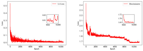 The network training lasted more than 100 days and converged after 8000 epochs. As can be seen in Figure 9, the loss function and the discriminator loss function decreased rapidly in the initial few thousand iterations, approaching a very small value after 8000 epochs.