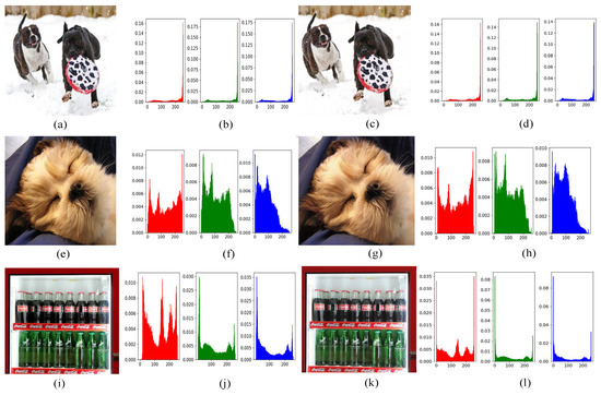Image histograms for the three test images: (a), (e), and (i): original images; (b), (f), and (j): histograms of (a), (e), and (i) for the three (RGB) channels, respectively; (c), (g), and (k): reconstructed images; (d), (h), and (l): histograms of (c), (g), and (k) for the three (RGB) channels, respectively, when scale = 1.