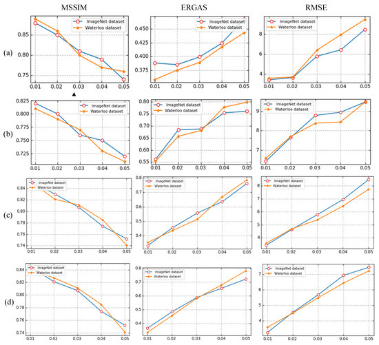 Comparison of the results of the RMSE, ERGAS, and MSSIM relative to the noise levels for different algorithms: (a) proposed algorithm, (b) Ref [32], (c) Ref [1], and (d) Ref [3].