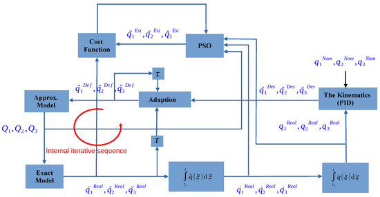 The PSO’s operation flow chart. The PSO block takes the information from the realized coordinates , their first time derivatives , and the control torque components so that it can calculate their estimated second time derivatives . These estimated values will be evaluated and compared with the realized second derivatives via the cost function defined as . Here, the usual process of PSO handles to search journey toward the global minimum in respect of the defined particles that can be found in Section 4. The dynamics of the PSO-based parameter tuning is not coupled to that of the adaptive control, in contrast to the operation of the classic tuning methods. The iterative sequence of the FPI-based adaptive controller is formed within the loop as indicated in the chart by a red curve.