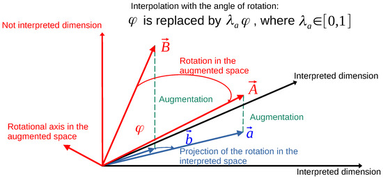 The symbolic description of the “abstract rotations”: the vectors of physically interpreted components are so augmented into the vectors by adding further orthogonal components to them that in the sense of the Frobenius norm. These vectors determine a TWO-dimensional plain within which B can be rotated into A with angle . The axis of the rotation is the -dimensional orthogonal subspace of this plain. Due to this rotation the physically interpreted projection of B, which is b, is exactly transformed into the physically interpreted projection of A, i.e., into a. The projections suffer rotation and dilatation or shrinking in . With the parameter , by making a rotation only with the angle instead of some nonlinear interpolation can be realized.