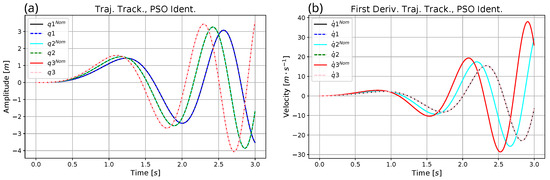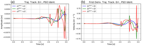 Trajectory tracking (a) and the first time derivatives (b) for the three robot links in the parameter identification process.