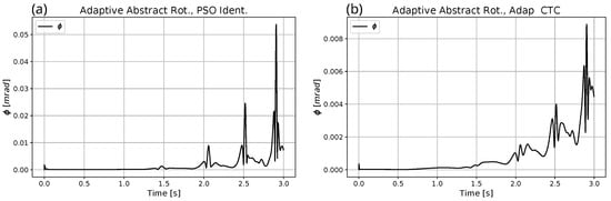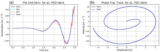 In fact, the trajectory tracking error in the PSO-based identifying process was between and whereas it increased in non-adaptive CTC within the range . The better improvement was in the adaptive CTC within the range . The same holds for the first derivative trajectory tracking error. It increased from in the original identifying process to in non-adaptive CTC. The error decreased to in adaptive CTC. The comparison can be seen in Figure 11, Figure 12 and Figure 13. The detailed explanation and interpretation of these observations are discussed in the sequel in Section 6.
