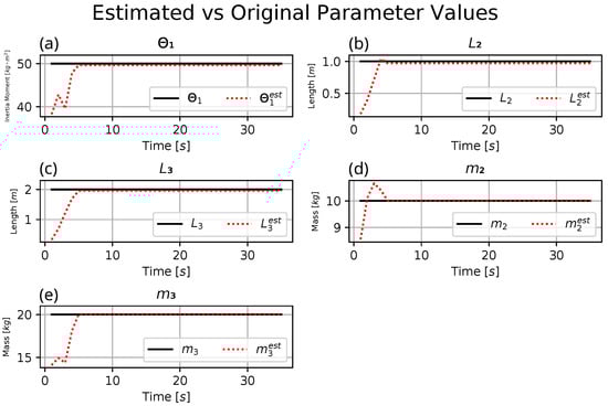 In general, it can be expected that in the case of an imprecise model the non-adaptive controller has to apply significant PID error correction terms to the second time derivatives of the nominal coordinates; therefore, in this case, quite considerable differences can be expected between the values of , , , and , , : the significant additions in the desired terms have the role of making the necessary corrections in the non-adaptive controller. For a good operation, the “Realized” values should well track these “Desired” ones, but this cannot be well realized in the non-adaptive controller. The limited applicability of the non-adaptive controller consists in this fact. However, when the adaptation mechanism is in use, it is expected that the “Realized” value better approximates the “Desired” one, consequently the necessary PID-type corrections in the “Desired” term continuously decrease in time, therefore both the “Desired” and the “Realized” values converge to the “Nominal” ones, while the “Deformed” ones can increase accordingly. (As the final results, the precision of trajectory tracking and that of the first time derivatives of the generalized coordinates can be compared by the use of Figure 11, Figure 12 and Figure 13. It can be seen that the non-adaptive controller that uses the identified parameters has the greatest error, the “second greatest error” belongs to the adaptive CTC controller using the original data, and finally, the most precise tracking was achieved by the adaptive controller using the identified model parameters.)
