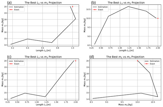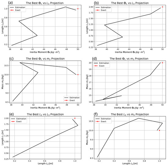 The accuracy of each estimated value for each targeted parameter is shown in Figure 8. For revealing the estimation accuracy in the five-dimensional parameter space, Figure 9 and Figure 10 display the story of the “best global particle” in various 2D projections.
