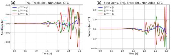 Trajectory tracking error (a) and its first time derivative (b) for the non-adaptive CTC controller using the identified parameters.