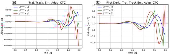 Trajectory tracking error (a) and its first time derivative (b) for the adaptive CTC controller using the identified parameters.