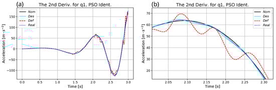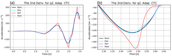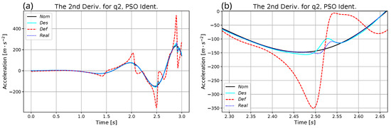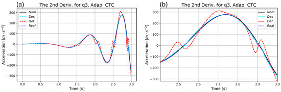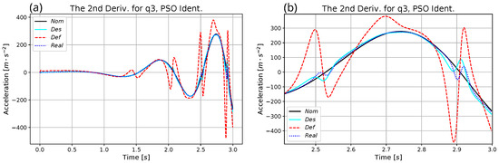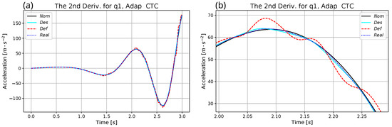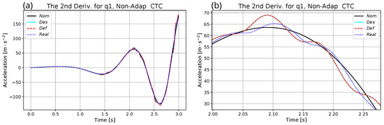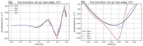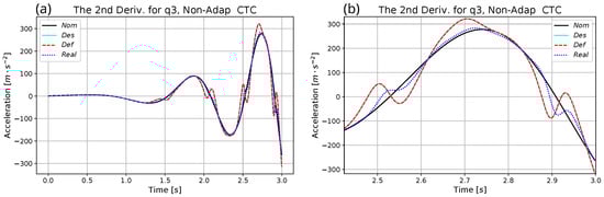 Second time derivatives for (a) and the zoomed-in excerpts (b) for the non-adaptive CTC controller using the identified parameters. The results of the simulation investigations generate conclusions detailed in Section 7.