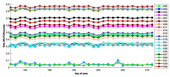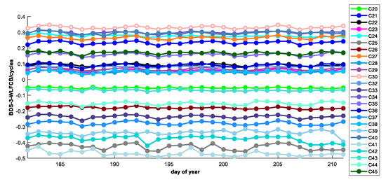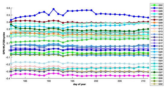 As WL FCBs are relatively stable, only one value per day can be estimated. In this paper, we used the MW combination to calculate GPS, GAL, and BDS-2 and BDS-3 WL FCBs. The 30-day WL FCBs with the Doy of 182–213 are shown in the following figures.