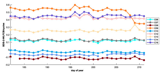 It can be seen from Figure 3, Figure 4, Figure 5 and Figure 6 that the WL FCBs of all systems maintained stable characteristics over 30 days. Most satellites had a fluctuation range of no more than 0.1 cycles in a single day. Only G03 had a fluctuation of about 0.12 cycles at day 191 and C09 had a fluctuation of about 0.2 cycles at day 198, which may have been caused by the restart of the satellite. Since G11 and G28 are marked as unhealthy satellites in the GPS navigation ephemeris, the WL FCBs were not estimated. The GEO orbit accuracy of BDS-2 and BDS-3 was bad and the WL FCBs were not estimated.
