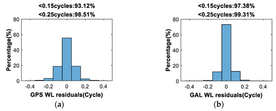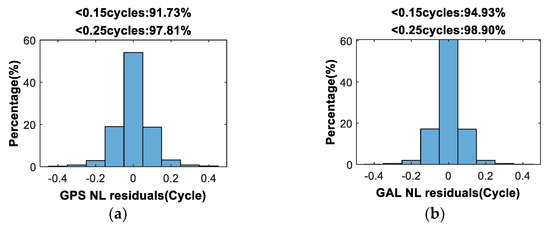 Distribution of NL float ambiguity posteriori residual errors (2021, Doy 185) as: (a) GPS WL float ambiguity posteriori residual errors; (b) GAL WL float ambiguity posteriori residual errors.