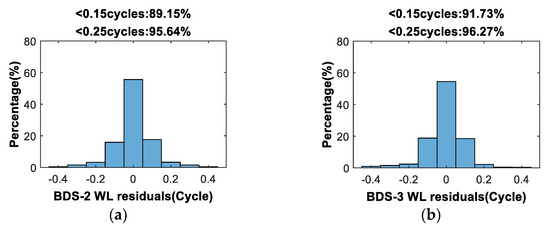 Distribution of NL float ambiguity posteriori residual errors (2021, Doy 185) as: (a) BD2 WL float ambiguity posteriori residual errors; (b) BDS-3 WL float ambiguity posteriori residual errors.