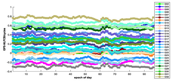 In Equation (19), the weight matrix can be determined by the variance in the float WL ambiguity in continuous arcs. In order to improve the robustness and accuracy of the solution, the IGG3 method can be used for iterative calculations [22]. The following points should be noted when calculating WL FCBs: the observation time of the WL float ambiguity is not less than 45 min in a continuous arc; the WL float ambiguity in the arc can be averaged to reduce the influence of observation noise and multipath; and for the ambiguity whose absolute residual error value is greater than 0.5 cycles, the corresponding integer ambiguity can be adjusted to perform a ± 1 cycles operation.