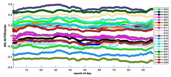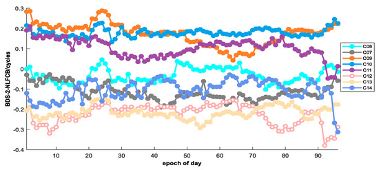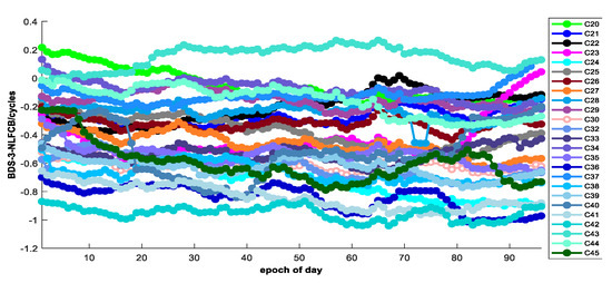 Similarly, we used the data described in Section 3.1 to obtain the PPP solution and we fixed the BDS-3 WL ambiguity by WL FCBs that was calculated in Section 3.1. Then, we calculated the BDS-3 NL float ambiguity. We estimated NL FCBs every 15 min, because the NL FCBs are unstable over one day. The BDS-3 NL FCBs for doy 185 in 2021 are shown in the following figures.