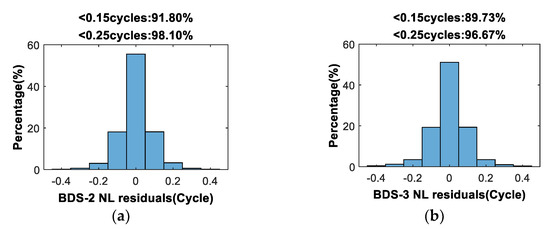 Distribution of NL float ambiguity posteriori residual errors (2021, Doy 185) as: (a) BDS-2 NL float ambiguity posteriori residual errors; (b) BDS-3 NL float ambiguity posteriori residual errors.