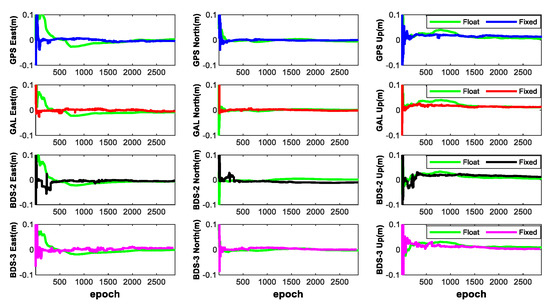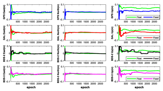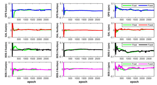 Table 2 shows that the mean TTFF of BDS-2 was the shortest and that the NL ambiguity was fixed at 21.5 min, because these stations are located in the Asia–Pacific region and BDS-2 has a large number of visible satellites. The WL mean ambiguity-fixed rates of three stations of GPS, GAL, BDS-2, and BDS-3 were above 95%. The GPS WL mean ambiguity-fixed rate was the lowest because G11 and G28 were marked as unavailable and the number of observable satellites was reduced, which reduced the WL ambiguity-fixed rate. The BDS-3 NL mean ambiguity-fixed rate was the lowest, mainly due to the low accuracy of orbit and clock products and its imperfect error-correction model. Based on the ENU mean convergence accuracy, it is obvious that all systems had the highest convergence accuracy in the E direction, followed by the N direction, and the U direction is the worst. The GPS mean point accuracy was the highest and the BDS-3 mean point accuracy was the lowest, which was directly related to the accuracy of the orbit and clock products.