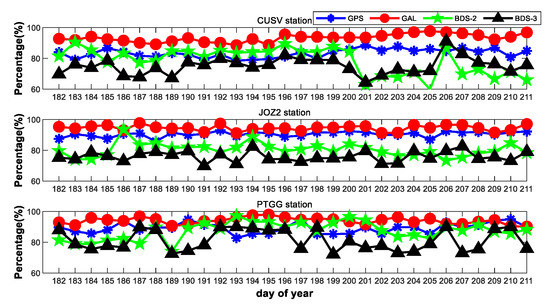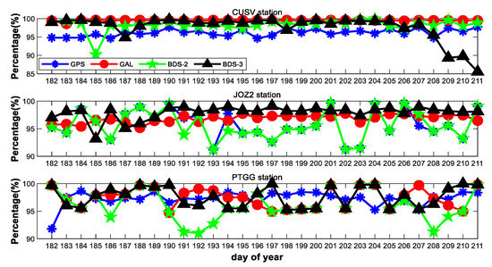 In order to ensure the long-time validity of GPS, GAL, BDS-2 WL, BDS-3 WL, and NL FCBs, we used the observation data of Asia–Pacific MGEX stations (CUSV, JOZ2 and PTGG) in 2021 (Doy 182–211) to perform the PPP-AR experiment. The WL and NL ambiguity-fixed rates are shown in the following figures.