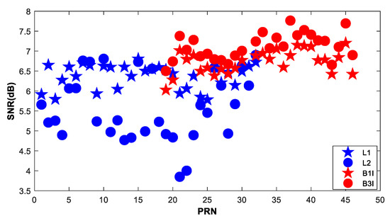 In view of the low fixed rate of the BDS-3 ambiguity in the above-described experiment, we analyzed the BDS-3 signal-to-noise ratio (SNR), orbit error accuracy, and clock error accuracy over 185 days and then we compared them with those of GPS. The results are shown in the following figures.