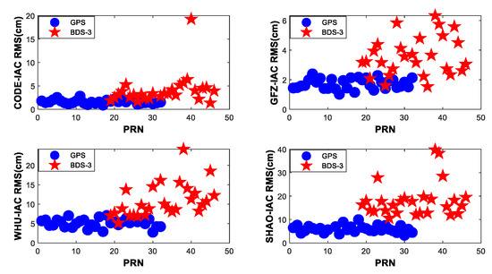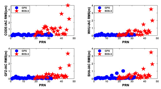 Figure 21 and Figure 22 show that the GPS orbit difference RMS values of CODE-IAC, GFZ-IAC, WHU-IAC, and SHA-IAC were about 1.64 cm, 1.73 cm, 5.15 cm, and 5.93 cm, respectively; the clock error difference RMS of CODE-IAC, GFZ-IAC, WHU-IAC, and SHA-IAC was about 0.11 m, 0.09 m, 0.10 m, and 0.15 m. The orbit and clock error difference RMS between the different ACs was relatively small. This shows that the GPS orbit and clock error estimation accuracy were high and there was little difference between different ACs. The BDS-3 orbit difference RMS values of CODE-IAC, GFZ-IAC, WHU-IAC, and SHA-IAC were about 4.05 cm, 3.59 cm, 10.85 cm, and 18.18 cm, respectively. The orbit difference RMS values of three Inclined GeoSynchronous Orbit (IGSO) satellites (C38, C39, and C40) were higher at about 5~40 cm between different ACs, respectively. The BDS-3 clock error difference RMS of CODE-IAC, GFZ-IAC, WHU-IAC, and SHA-IAC was about 0.97 m, 0.55 m, 0.50 m, and 0.50 m. The BDS-3 orbit and clock error difference RMS values between the different ACs were relatively large, indicating that the consistency of the BDS-3 orbit and clock error products was poor and that there were significant differences between different ACs, especially the IGSO satellite and Medium orbit earth (MEO) satellite (C45 and C46).