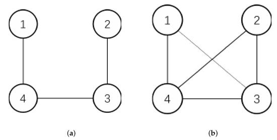 Consider the same problem as in Example 1, but with the payoff matrix shown in Table 2 and the networks in Figure 1a,b. Assume the initial strategy profile . Similar to Example 1, we can obtain that the matrix for both graphs are