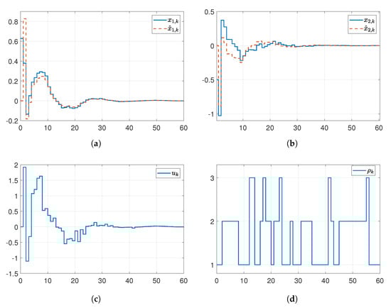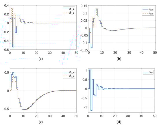 state behavior and control input are shown in Figure 1a–d, in which Figure 1a–c present the asymptotic convergence of , and . Moreover, the observed states , and asymptotically track the real , and , respectively. In addition, Figure 1d shows the behavior of control input that proves the well-defined control problem. Eventually, Figure 1 shows the availability and validity of the observer and controller gains designed by Theorem 1 for (35),