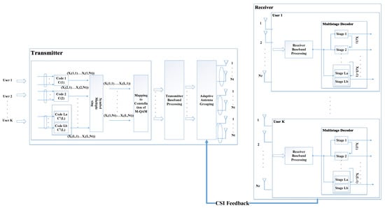By considering the Multi-User MIMO system in which the base station is equipped with transmitting antennas, the total number of receiving antennas at the receiver side is At a particular time, BS transmits the signal to K independent multiple-antenna users, as shown in Figure 2, with . AAG provides full spatial diversity and coding gain with higher throughput.