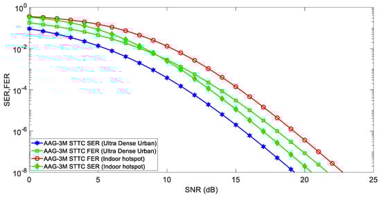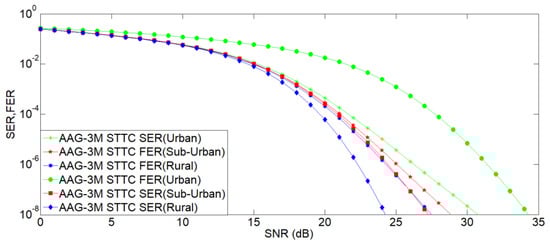 As the SER and FER are developed, Figure 4 compares the outcomes for rural, urban, and sub-urban macro deployment scenarios in the ITU-R M.2135 standard for AAG-3M STTC in the Massive MIMO scenario. In comparison to urban and suburban settings, it has been shown that the mistake rate has decreased. Due to a larger service area, the rural model system supports high-speed vehicles. As a result, it concentrates on bigger cells. Additionally, LOS is feasible in rural places due to the lower density of buildings and the longer BTS. In suburban areas, MS is placed at street level, whereas BTS is maintained at a level higher, i.e., on rooftops, to provide better coverage. In comparison to metropolitan regions, the number of floors is modest; second, houses and offices are separated from one another. There are more grounds available; therefore, it is larger. As they do not follow a grid layout, street patterns are random, and foliage loss is lower than in metropolitan areas. In this model, building height and density are substantially higher than in suburban and rural areas, resulting in higher losses.