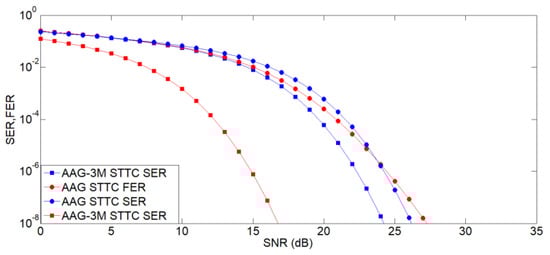 However, the array has been increased to make the constellation points for 64 QAM. This system should require three levels of encoding. It increases the complexity as it requires a minimum of four encoders at the transmitter, but it is manageable even for a bigger constellation; hence, it increases the throughput that is one of the required parameters for the QoS in the latest scenario. As the level of modulation increases to 128 QAM or even more as it provides higher throughput and spectral efficiency, at the same time, there are some limitations, i.e., the complexity and less resilience to the noise of higher-order modulation. For higher-order constellations, the distance between the constellation points becomes closer and more sensitive to noise, and the error rate is increased as compared to lower-order modulation. Therefore, the system requires a balance between the information error rates. The use of AAG in STTC creates the balance between error performance spectral efficiency and complexity. Using the AAG in STTC for 64 QAM or 128QAM, the error performance is comparable to STTC with reduced complexity.