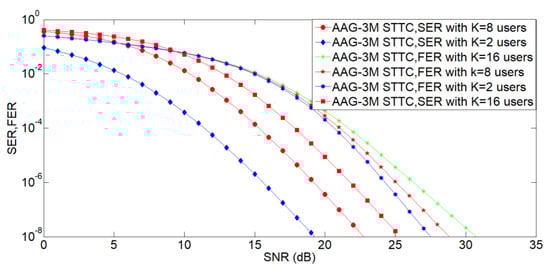 In this section, the paper analyzes the performance of AAG-3M with different numbers of users for (K = 2,8 and 16) with a fixed number of base station antennas ( = 64, as shown in Figure 7) in an urban scenario. The performance in terms of SER and FER degraded as the number of users increased because more signal power is required as the number of users increases.