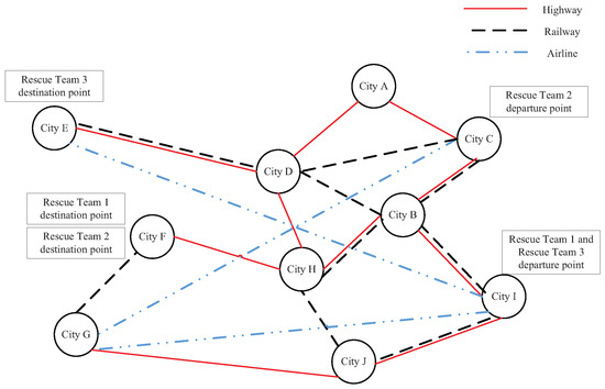 In essence, the optimization problem of multi-commodity emergency logistics planning can be abstracted as a multipoint-to-multipoint transportation planning problem in a given multimodal traffic network. The characteristic of multimodal transportation is to transport supplies through two or more different modes of transportation, such as highway, railway, aviation, inland waterways, and short-distance or long-distance maritime transportation. An illustration of the emergency logistics planning problem is shown in Figure 1. With an increasing attention to emergency logistics, emergency logistics under multimodal transportation has also been a heated research field, extending to many real-world applications [5,6,7].