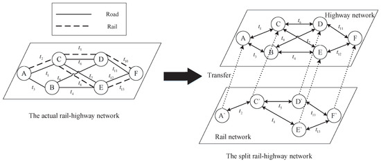 In our shortest-path algorithm under a multimodal traffic network, network splitting is used to depict various traffic networks. An illustration of network splitting in a double modal (rail-highway) network is shown in Figure 2. The connection lines refer to the transfer between different transportation modes. The nodes in the high-priority network are connected only in one direction to the nodes in the low-priority network, and the reverse connection time is infinite, which prohibits the transfer.