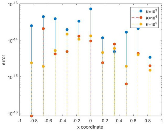 where the value of is taken as . The error for this equation is provided for in Table 3. It is shown that even with small values of m, high accuracy can be achieved for large values of k, i.e., . Figure 2 also presents this phenomenon.