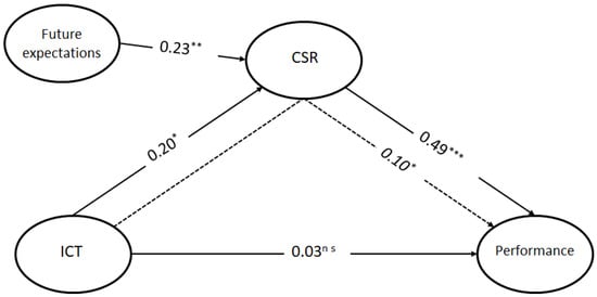 The results are shown in Table 7 and Figure 2. Our results suggest that the direct impact of ICT adoption on performance is not significant (β = 0.034). Hence, H1 is rejected. Additionally, an indirect effect through CSR is found in this relationship (β = 0.097 *). Next, the variance that accounted for (VAF) [] was evaluated. VAF determines the size of the indirect effect in relation to the total effect. In this sense, the indirect effect of ICT adoption on performance is about 74%. Therefore, the results suggest that CSR fully mediate this relationship, and H4 is supported. Furthermore, the impact of ICT adoption on CSR is positive and significant (β = 0.200 *), verifying H2. In relation to the effect of future expectations on CSR, the path value (β = 0.227 **) shows a positive and significant influence. Hence, H5 is supported. Finally, with regard to the effect of CSR on performance, the results give a positive and significant effect (β = 0.487 ***), supporting H3.