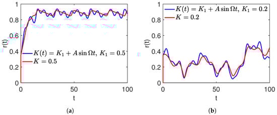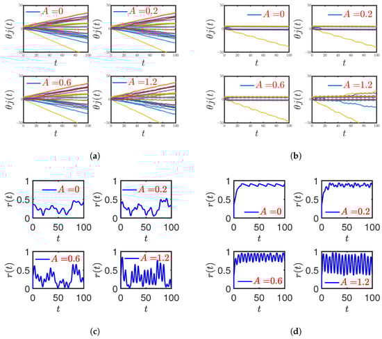The comparisons were made in the vs. t graphs using the uniform and time-varying coupling strengths. Additionally, the response of was observed more closely in by varying amplitude A and frequency of the perturbation term separately.