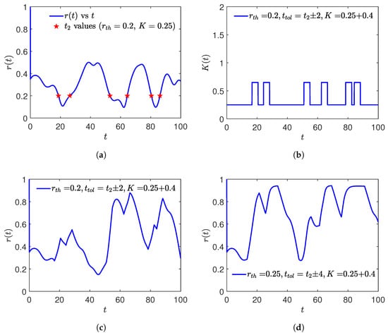 The threshold value of the order parameter selected in the vs. t graph, below which an additional value of coupling strength () is applied, is a tentative mid-value (). Oscillations observed in the vs. t graph above are assumed to be holding the synchronous behavior of oscillators.