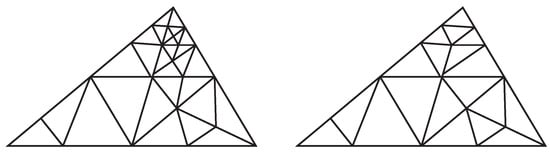 For coarsening a refined mesh, we may consider different approaches, such as removing nodes, swapping edges, or amplifying elements []. Here we study the shortest-edge duplication of a triangle as a simple procedure to be applied to those triangles for coarsening a triangular mesh that has been obtained by the iterative application of local refinements based on longest-edge bisection. This method shows to be effective at coarsening meshes while improving the smallest angle. On the other hand, if it is desired to maintain the resolution of the mesh while improving the smallest angles, the method can be combined with a local refinement strategy to improve high-order mesh quality while maintaining sufficient resolution, for example, by the self-similar refinement scheme [,], albeit this issue will not be tackled in this paper. It should be underlined, however, that there have been recent approaches, such as the -adaptivity, which are able to address this problem [].