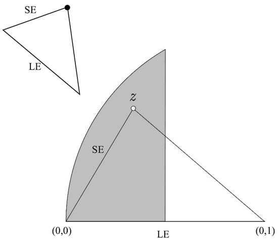The values of function w, depending on the position of point z in each sub-region, may be easily deduced. As a matter of example, Figure 5 shows the definition of function for z in the first two lower subregions of the space of triangular shapes. Similar figures may be found for the other subregions. In Figure 5 right, , while in Figure 5 left, in order to normalise the triangle to have its shortest edge on the left side, so that belongs to .