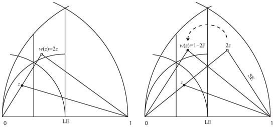 For , , since . Other fixed points for w are and . In sub-region I, as denoted in Figure 8, , which is an inversion with respect to the circumference of equation , or . Therefore, for z in the arc of that circumference which is in region I, . It may be easily verified that these are the only fixed points for . Notice that although is another fixed point, that triangle is invalid and does not belong to the space of triangular shapes where it is required . Further, it follows that for , . For example, for , which corresponds to the equilateral triangle, then , where .