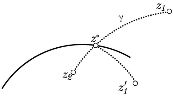Suppose now that and are not in a region with the same definition of w. and may be in two regions sharing a common boundary. In this case, there is in the region of with because of the symmetry of w with respect to the boundary. Let be the geodesic line that joins and . intersects the boundary at a point, say . Then, since points , and are in the same geodesic, . Further, because and are symmetrical points with respect to the boundary containing . See Figure 7.