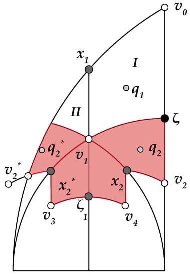 In order to prove that the orbit for any point z is finite, we will use the division of the normalised region is shown in Figure 8. We consider the sets , with , where . It is clear that . These sets are the coloured subsets in Figure 8. The points labelled in the figure are , and are pre-images of . Similarly, , , , , and . Further, is the pre-image of in region ; that is, , while .