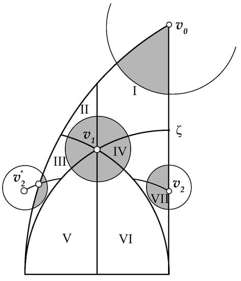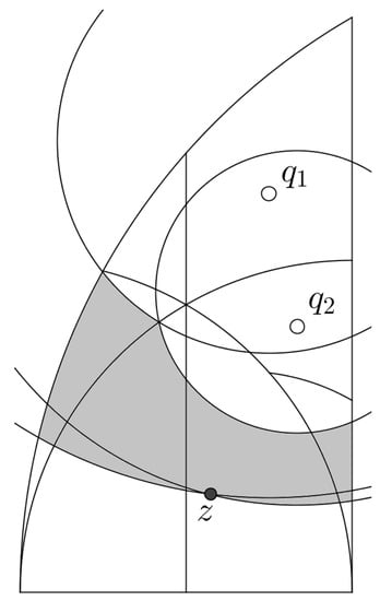 Notice that may be chosen such that every hyperbolic circle with centre , , or and radius intersects only the geodesic lines defining w that pass through their centres, as Figure 9 shows.