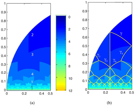 Note that the region where all the trajectories end in the diagram is located at the dark blue region. Therefore, we can determine a lower bound of the maximum of the smallest angles for the last generated triangles of , which are related to the apex with . It can be seen that the smallest angle in each of the regions generated by duplicating its shortest edge is bounded from below with total independence of the initial point of the respective trajectories. This is a salient property in comparison with the evolution of the angles in other longest-edge schemes, for example, in the 4T-LE partition. In the case of 4T-LE partition, these lower bounds depend on the geometry of the initial triangle. See [,] for details on the evolution properties of the angles when the 4T-LE partition is recursively applied. In Table 1, the minimum angles generated in the process are listed.