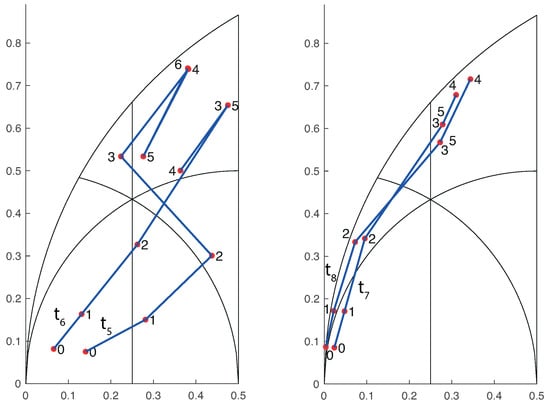 Table 2 shows the evolution by the SE duplication applied to four more triangles sharing the same minimum angle, . It should be noted that, as before, the generated triangles are better shaped than the previous ones until the respective orbit ends in subregion . We observe that triangle 8 is an acute isosceles, and all triangles of its orbit are acute.