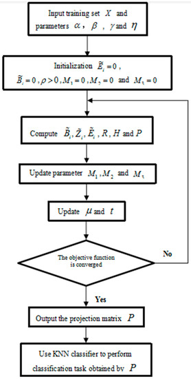 | Input: Parameters , , and ; and Training set X in Equation (14). Initialization: = 0, = 0, > 0, = 0, = 0, = 0. Repeat Step 1. Fixing , , , and , update with Equation (17); Step 2. Fixing , , , and , update with Equation (20); Step 3. Fixing , , , and , update with Equation (22); Step 4. Fixing , , , and , update with Equation (24); Step 5. Fixing , , , and , update with Equation (26); Step 6. Fixing , , , and , update with Equation (28); Step 7. Update parameter , , and as follows: Update through ; Update through ; Update through ; Step 8. Update through ; Step 9. Update through t = t + 1; Until Equation (11) is converged. Step 10. Obtain the (, , , , , ) optimal solution; Output: Obtain projection matrix |