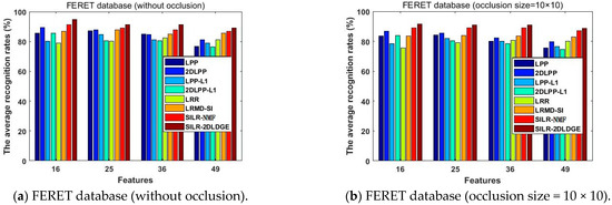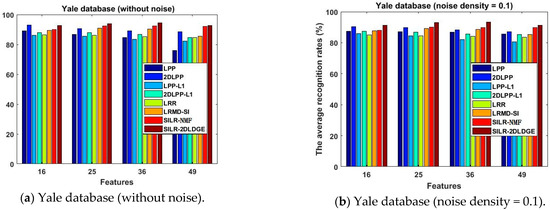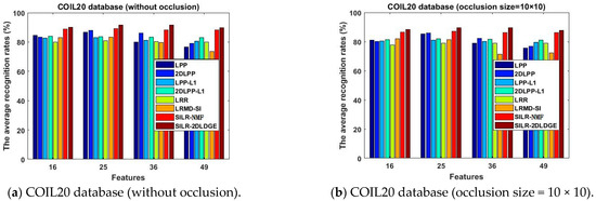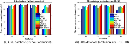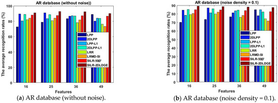 - The SILR-2DLDGE algorithm has the advantages of low-rank learning, sparse learning, and incoherent structure learning, similarly to the SILR-NMF algorithm, as well as the advantages of graph embedding, which shows that more discrimination information can be obtained by sparse learning combined with the L1 norm and L * norm. We can see from the curve changes in Figure 3, Figure 4, Figure 5, Figure 7, Figure 8 and Figure 9 that the average recognition rates of this algorithm in three noisy databases and three occlusion databases are higher than that of other algorithms, which fully show that our algorithm has stronger robustness than other algorithms.