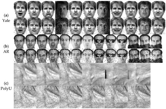 Experiments were carried out on different levels of random pixel corruptions to verify the robustness of the algorithm. “Salt & pepper” noise with a density of 0.1 was added to the Yale, AR, and PolyU databases for corrosion experiments.